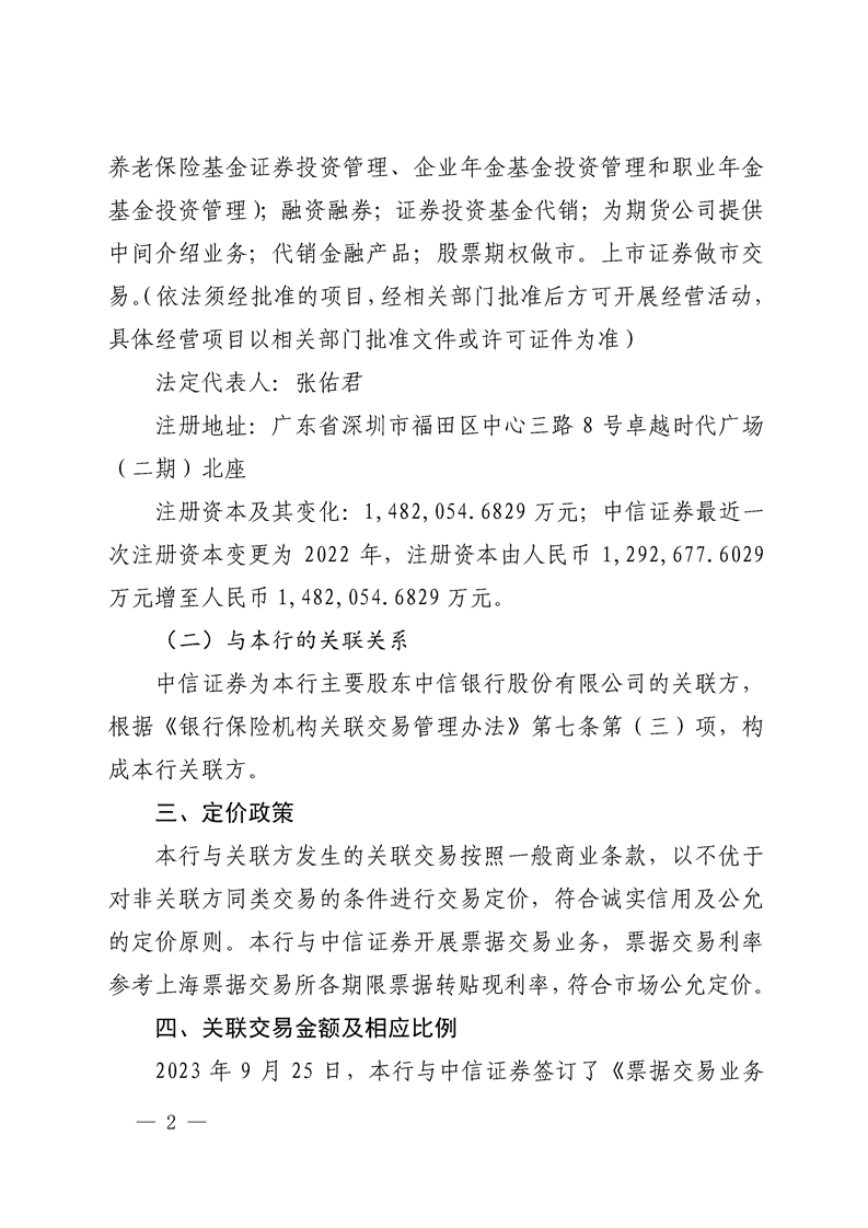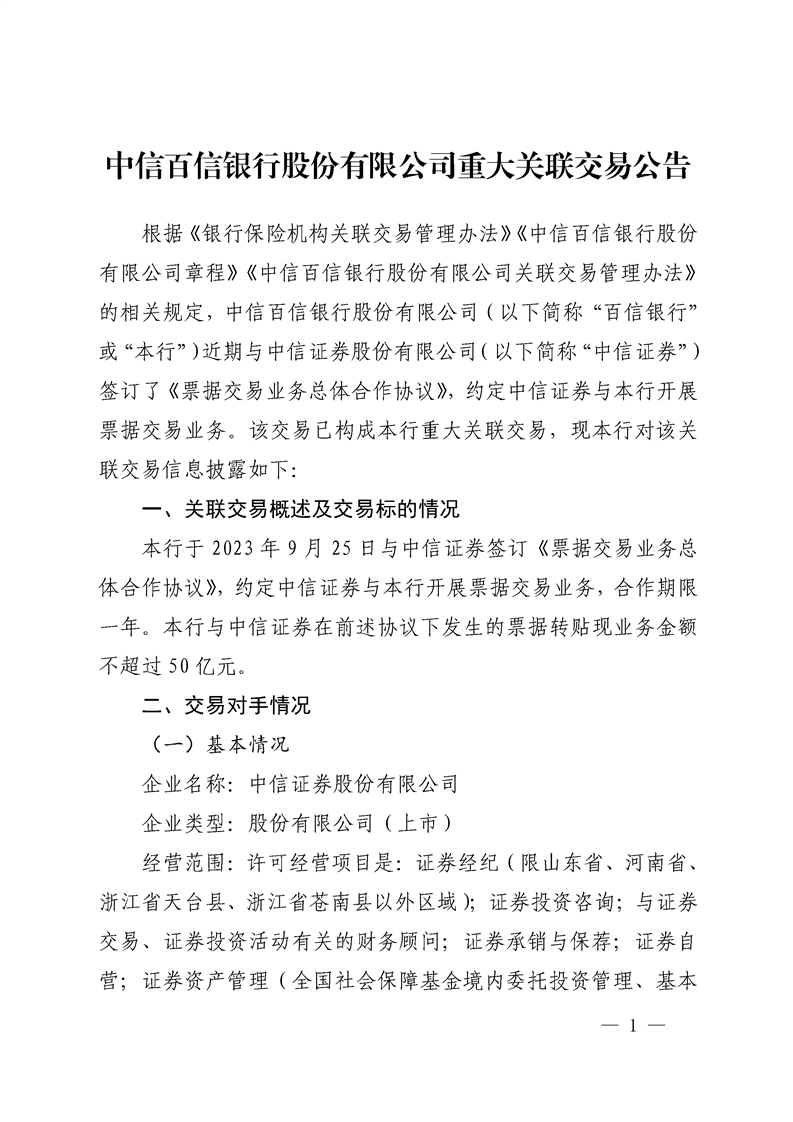中信百信银行股份有限公司重大关联交易信息披露公告