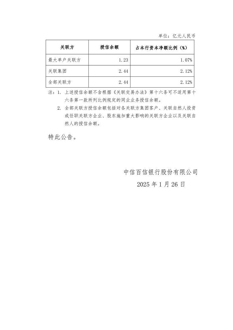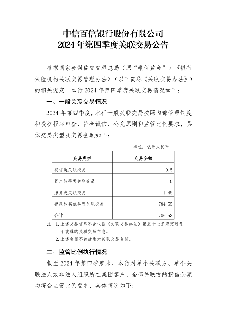 中信百信银行股份有限公司2024年第四季度关联交易公告