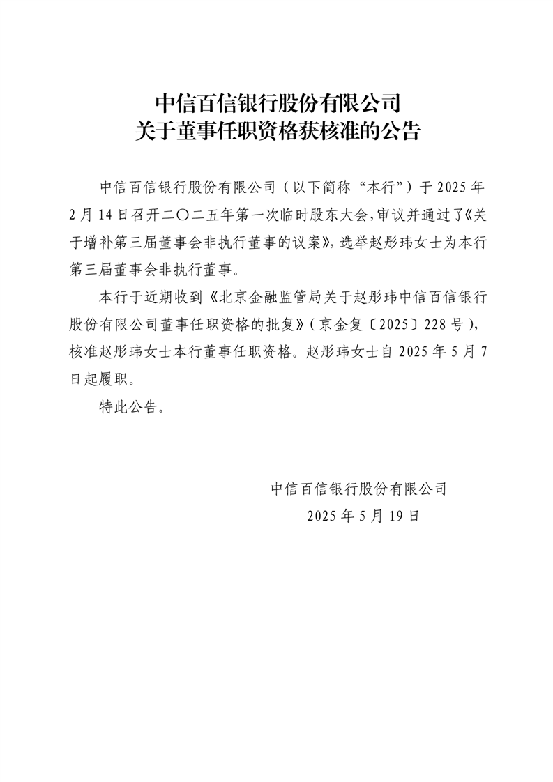 中信百信银行股份有限公司关于董事任职资格获核准的公告