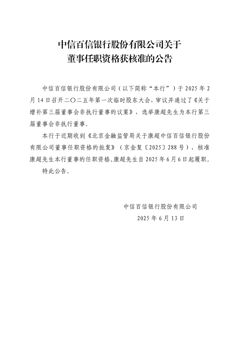 中信百信银行股份有限公司关于董事任职资格获核准的公告