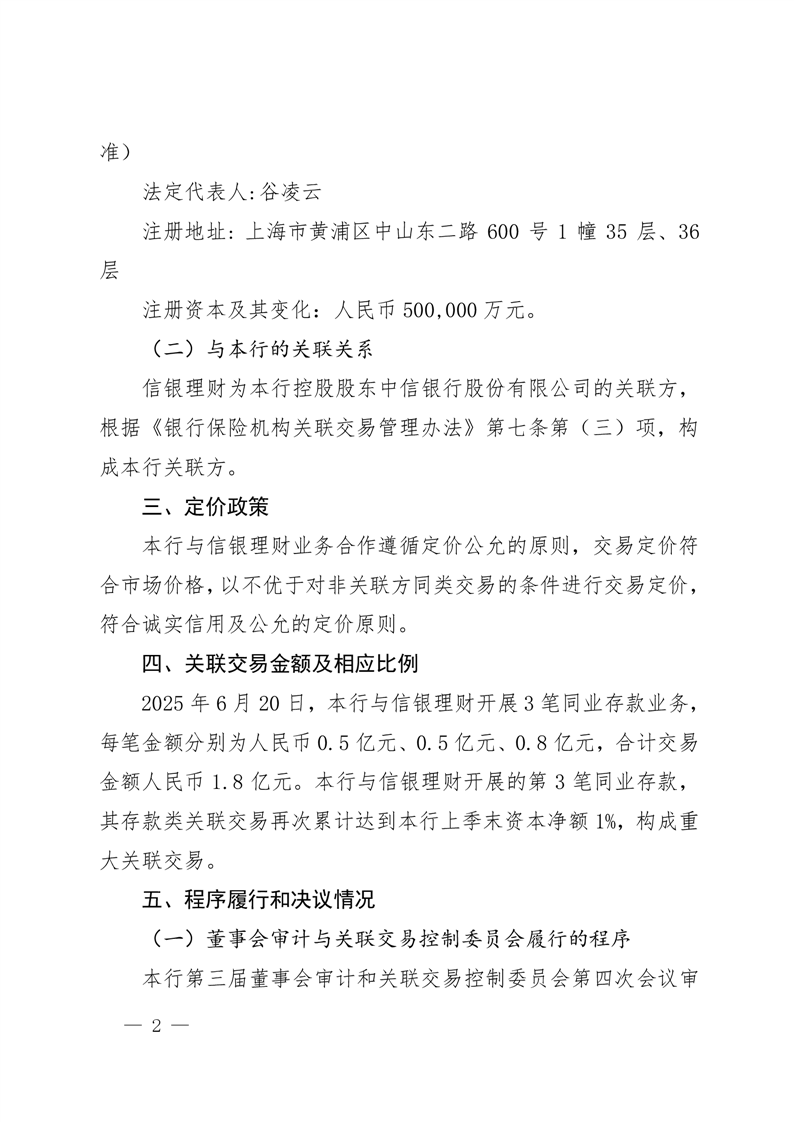 中信百信银行股份有限公司重大关联交易公告