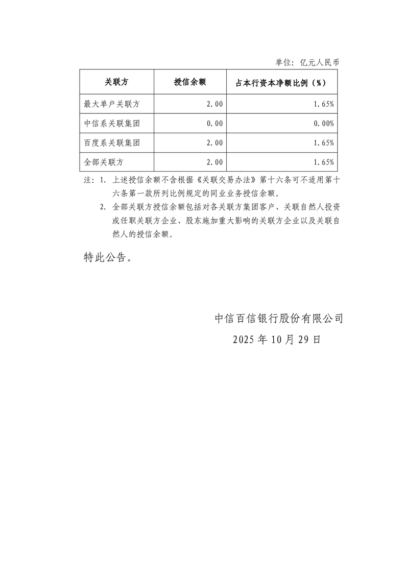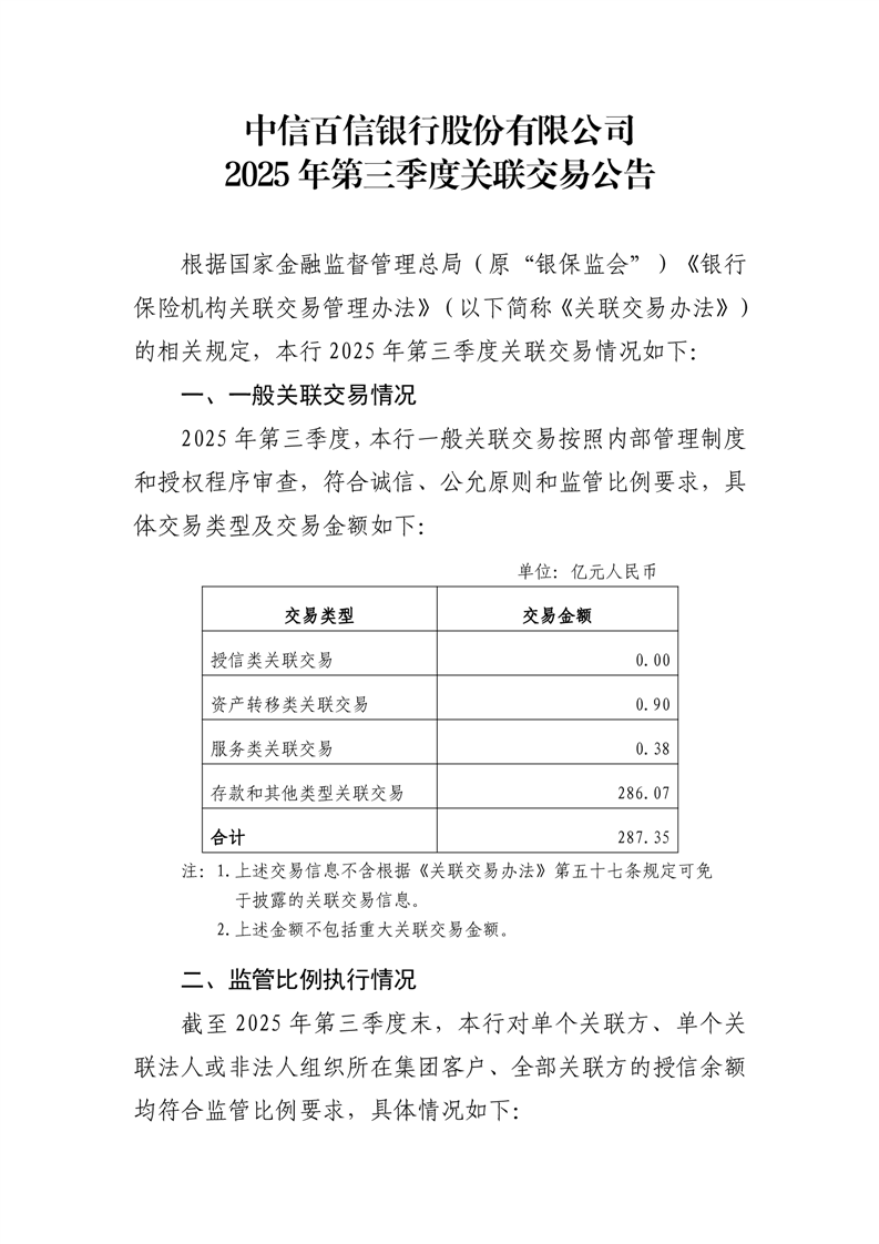 中信百信银行股份有限公司2025年第三季度关联交易公告