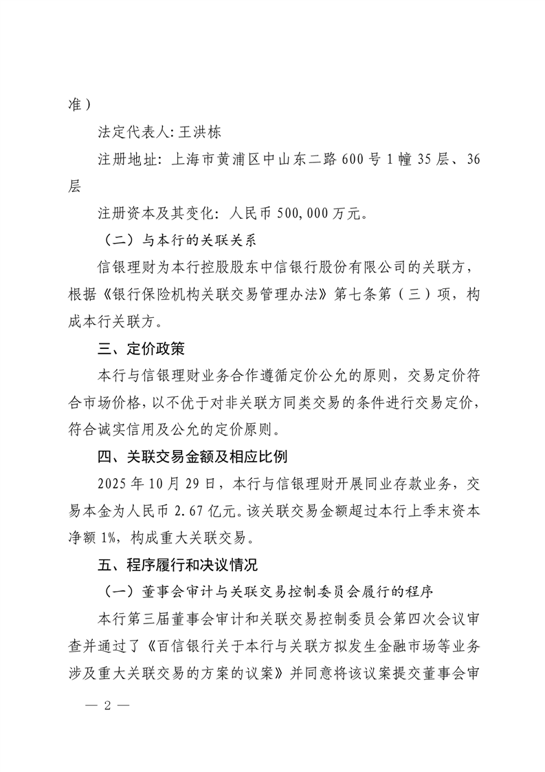 中信百信银行股份有限公司重大关联交易公告