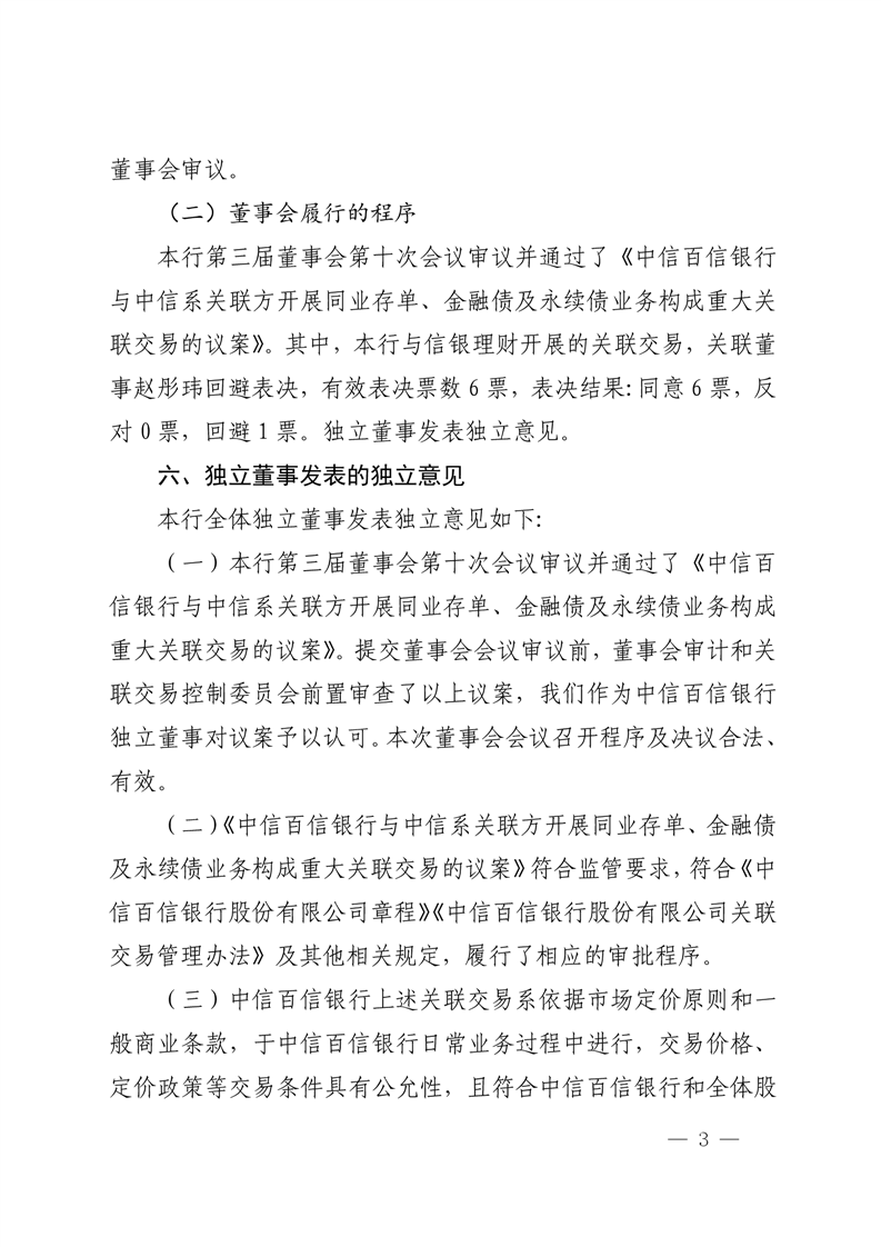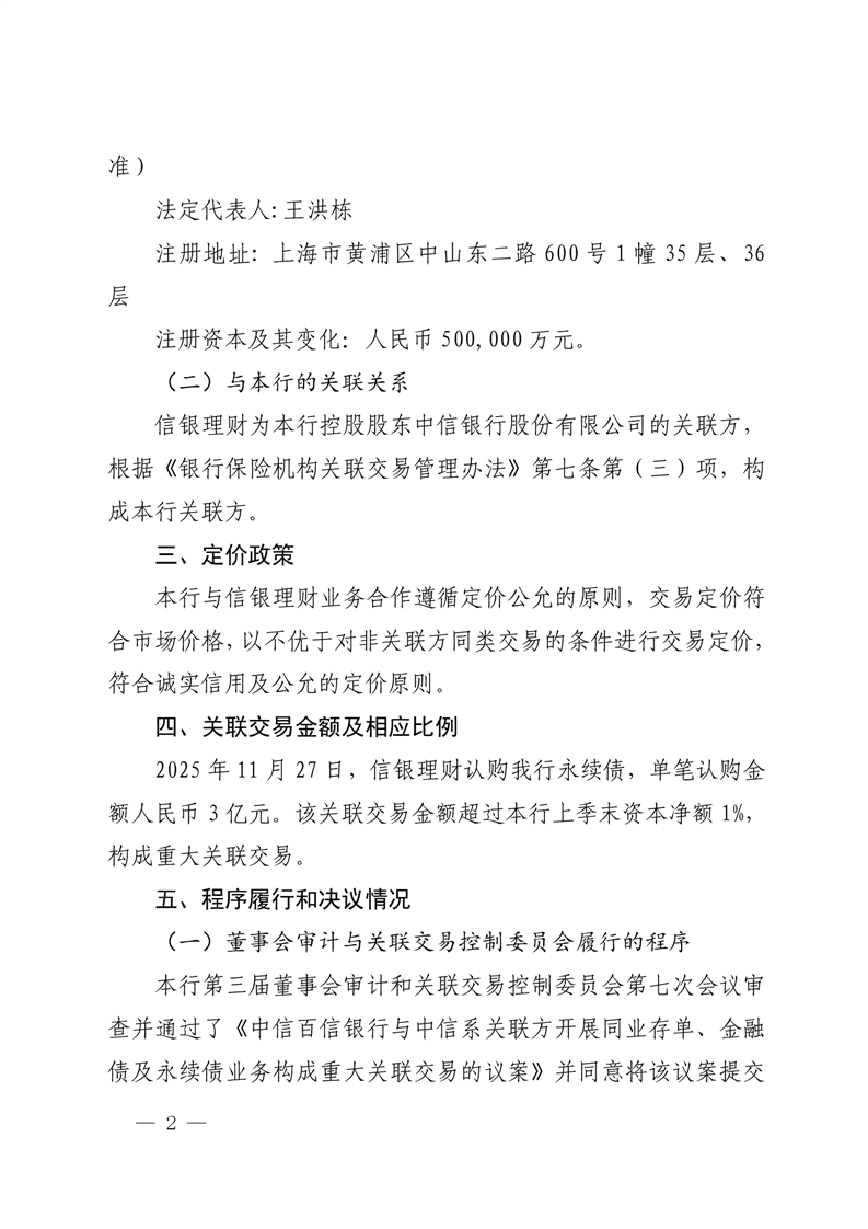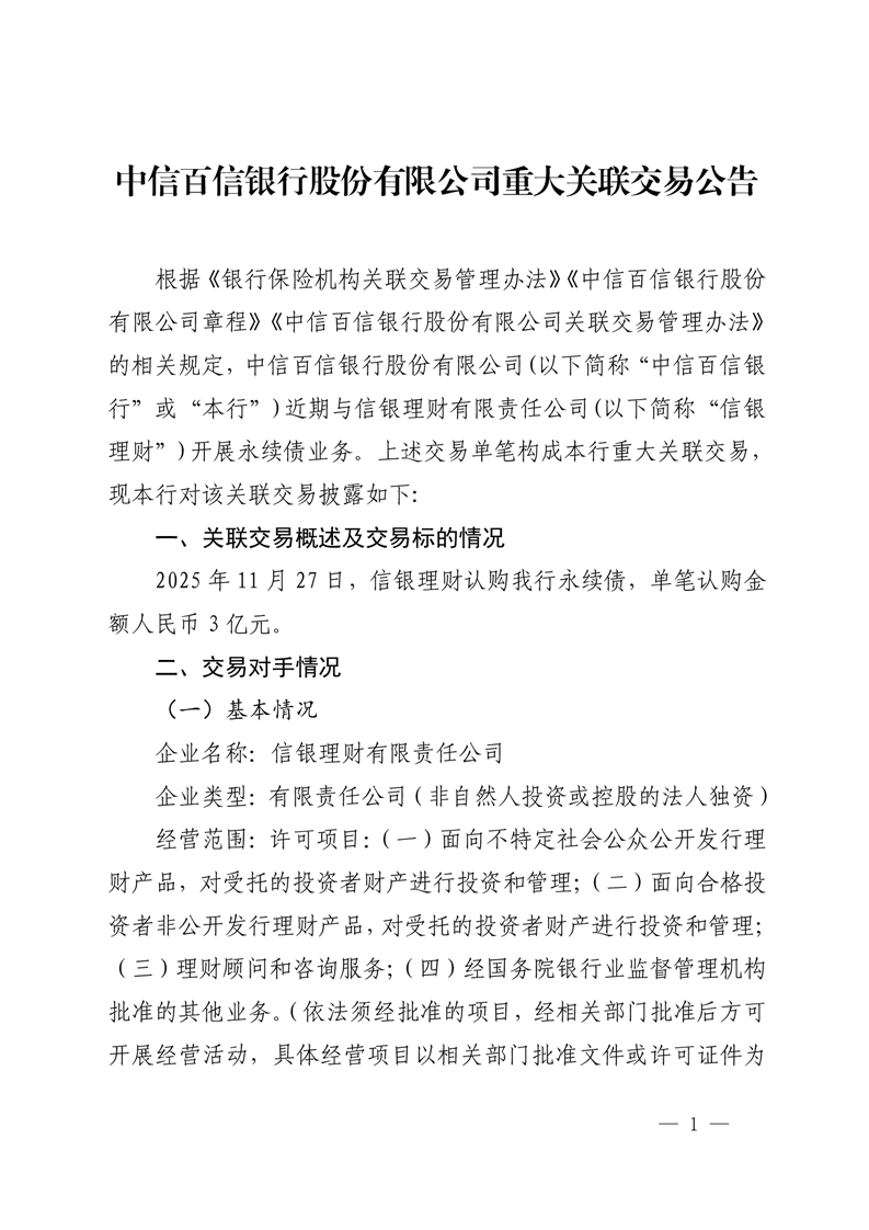 中信百信银行股份有限公司重大关联交易公告