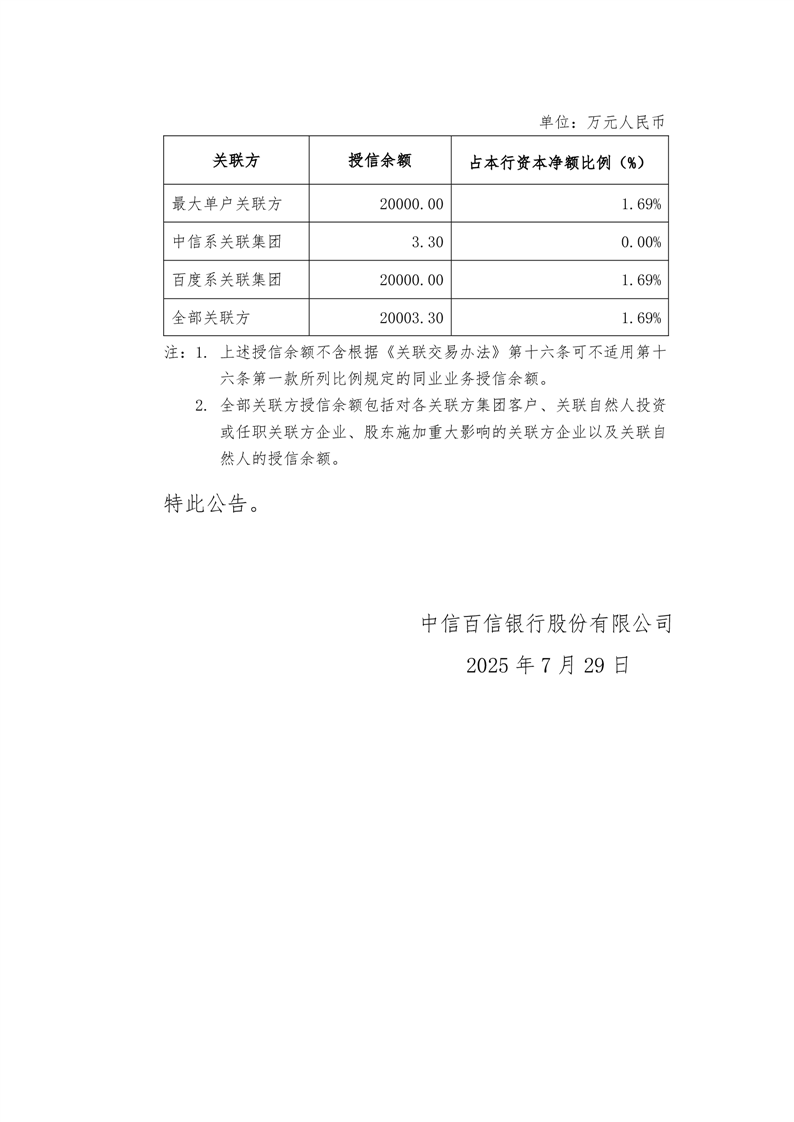 中信百信银行股份有限公司2025年第二季度关联交易公告
