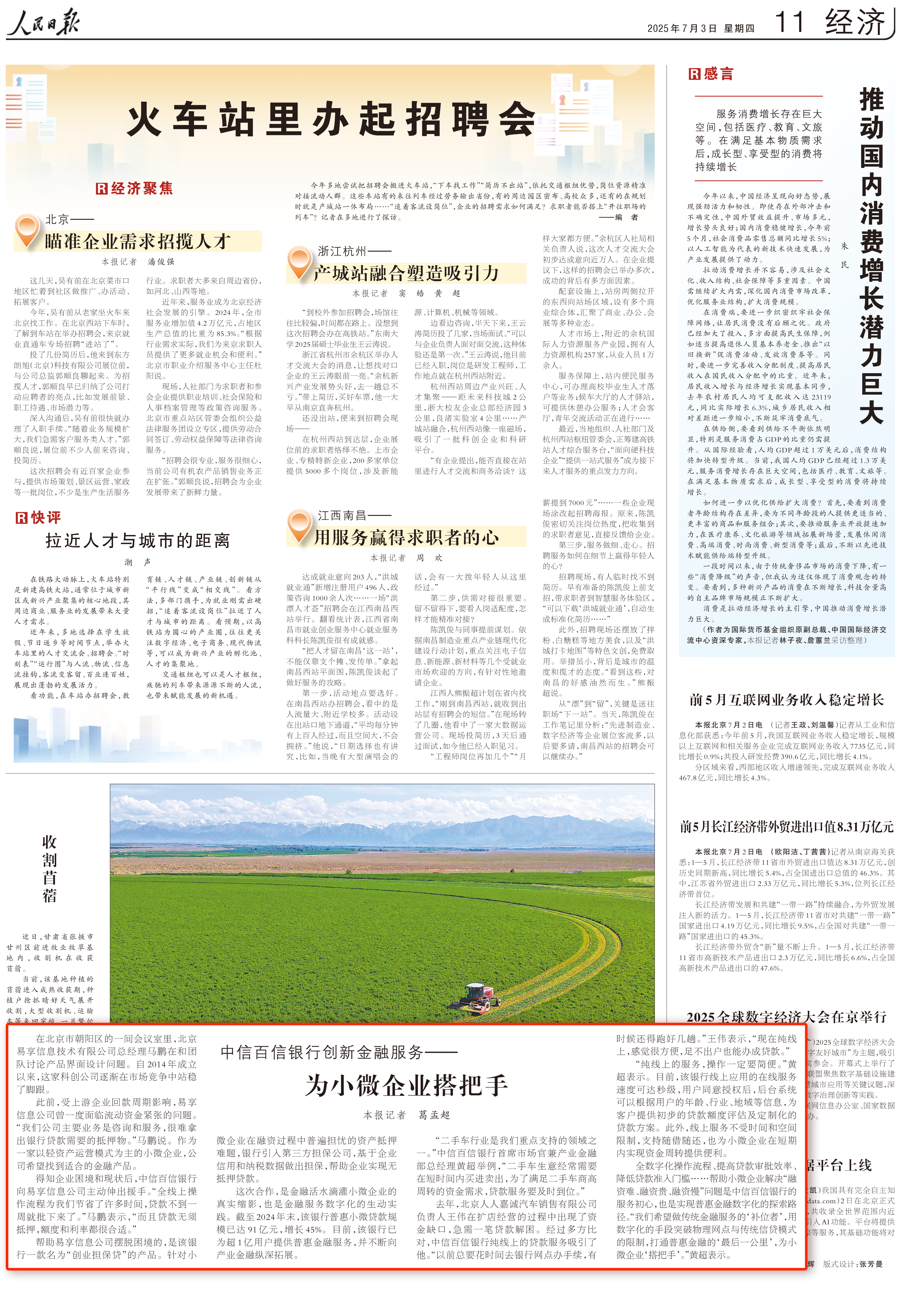7月3日,人民日报经济版专题报道了中信百信银行创新金融服务助力小微企业的实践成果。全线上操作流程、提高贷款审批效率、降低贷款准入门槛,通过数字化技术帮助小微企业解决“融资难、融资贵、融资慢”问题是中信百信银行的服务初心。截至2024年末,该行普惠小微贷款规模达91亿元,较去年增幅45%,并不断向产业金融纵深拓展。以下是报道原文: